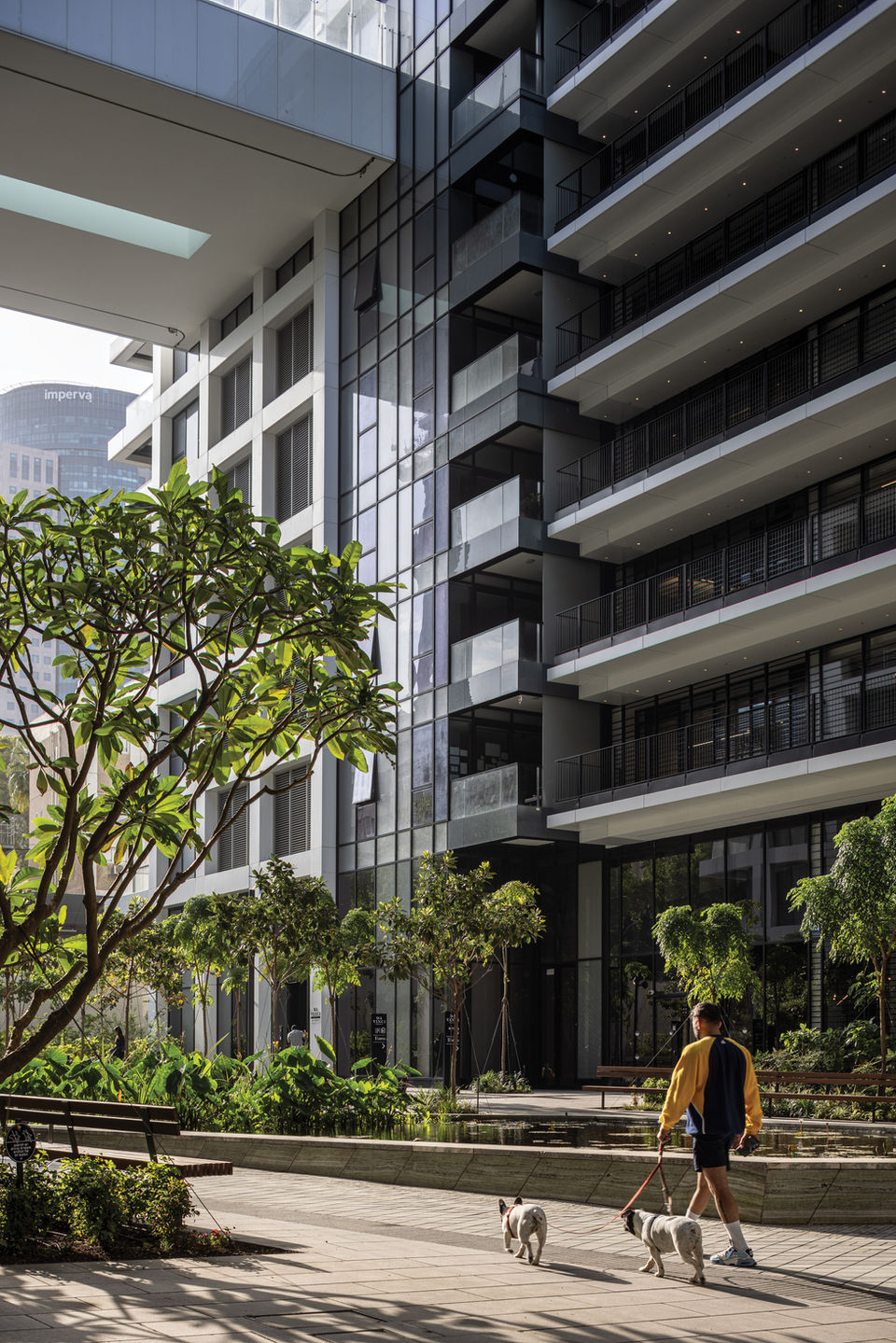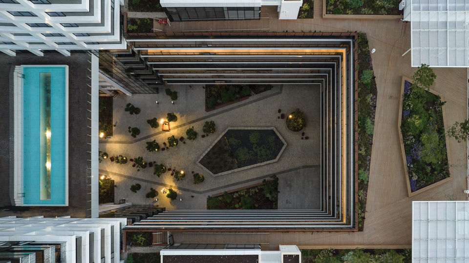 The Da Vinci complex, combining residences, offices, retail, and public areas, was designed by Avner Yasahr Architects as a groundbreaking urban icon around an impressive central patio, with retail facades and a pool suspended between the two towers.
